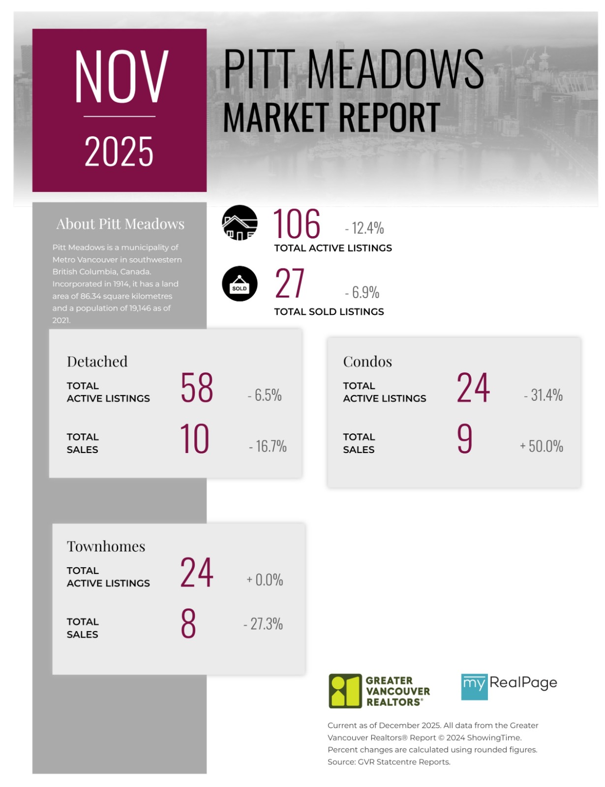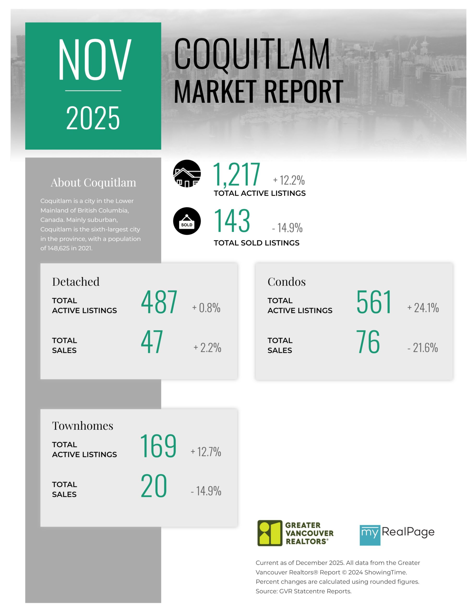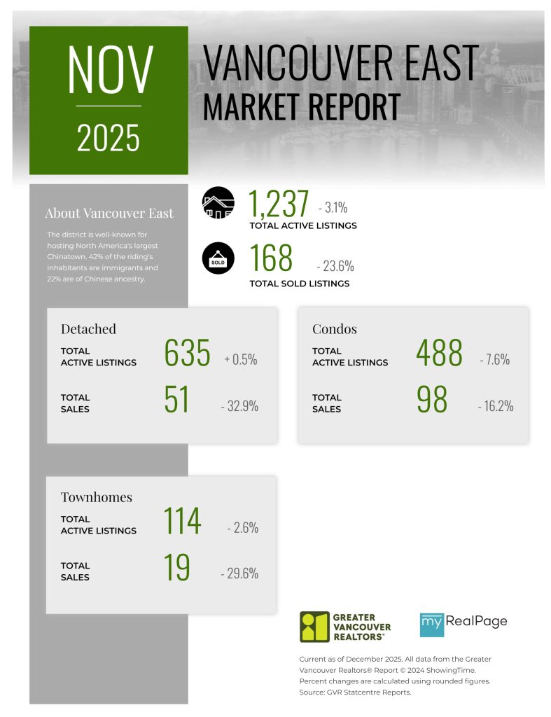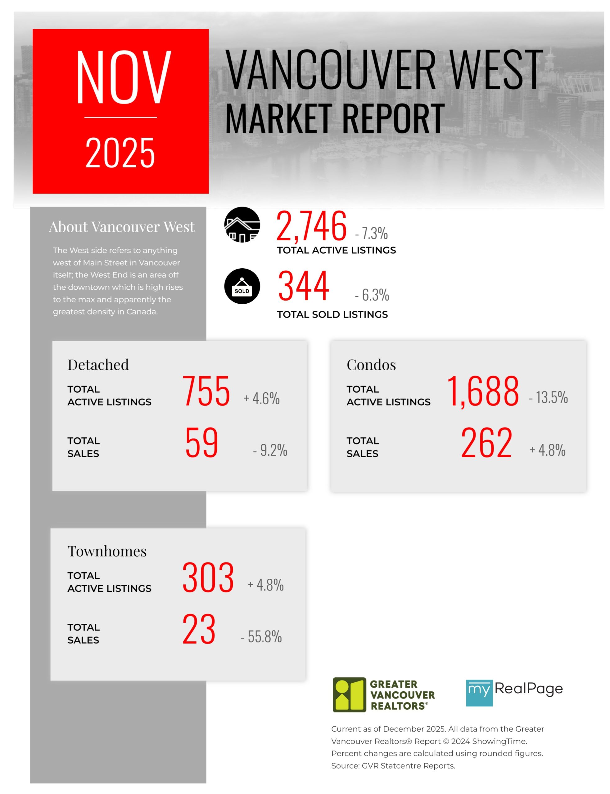 “As the year draws to a close, the data continues telling a story of a market with many buyers patiently waiting and sellers adjusting to market conditions not seen in years. Inventory remains healthy, providing buyers ample choice, which, by contrast, is pushing sellers to accept that pricing must reflect this new reality. Buyers and sellers are striking deals when their expectations are aligned and reflective of the current market – not the market of years ago.” said Andrew Lis, GVR director of economics and data analytics