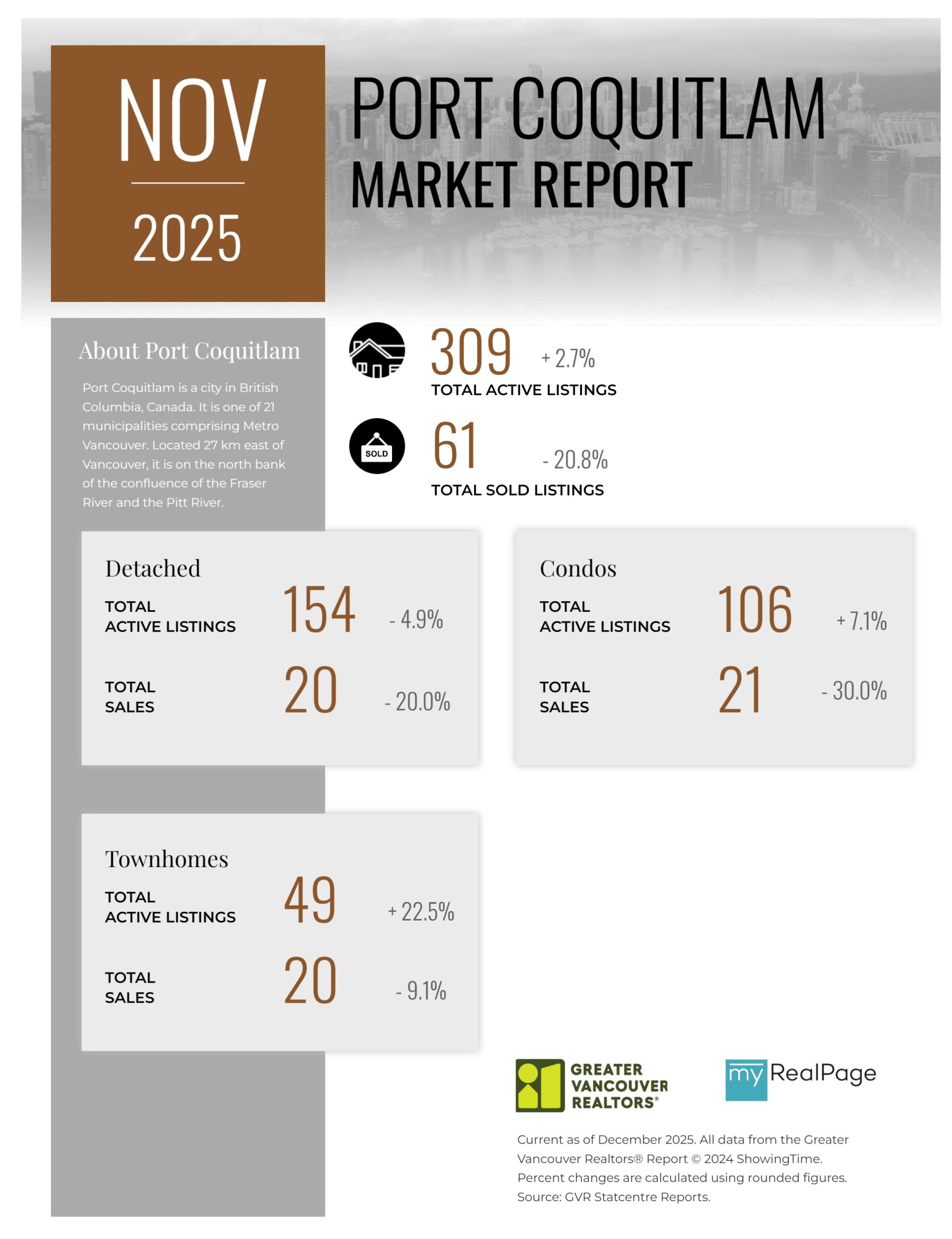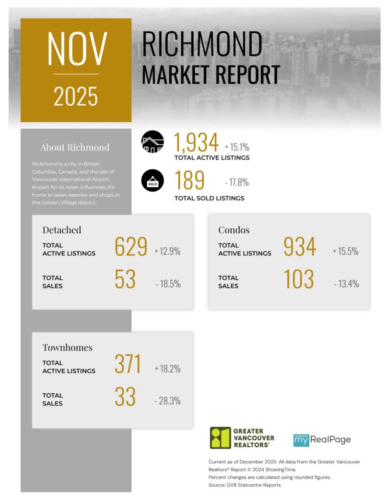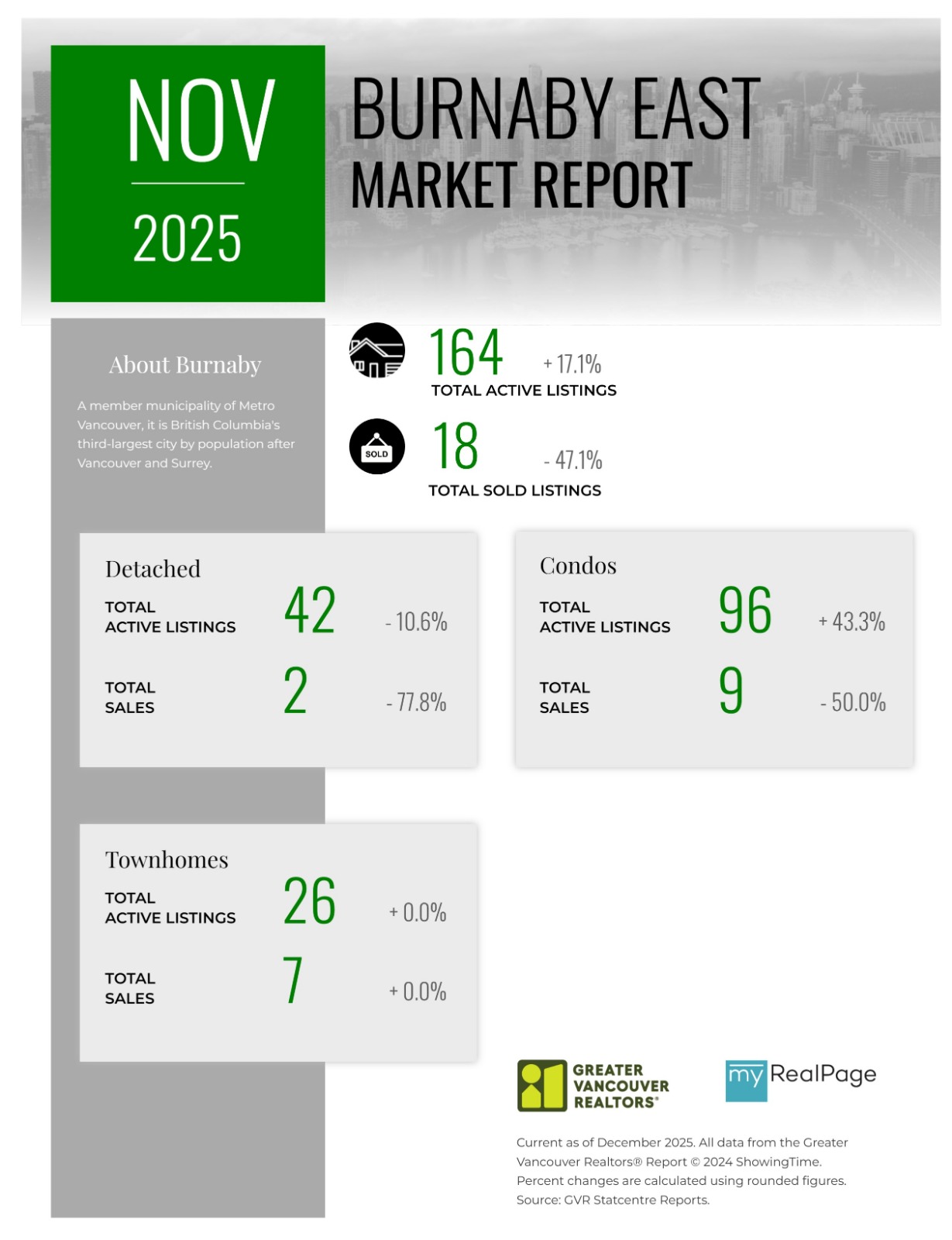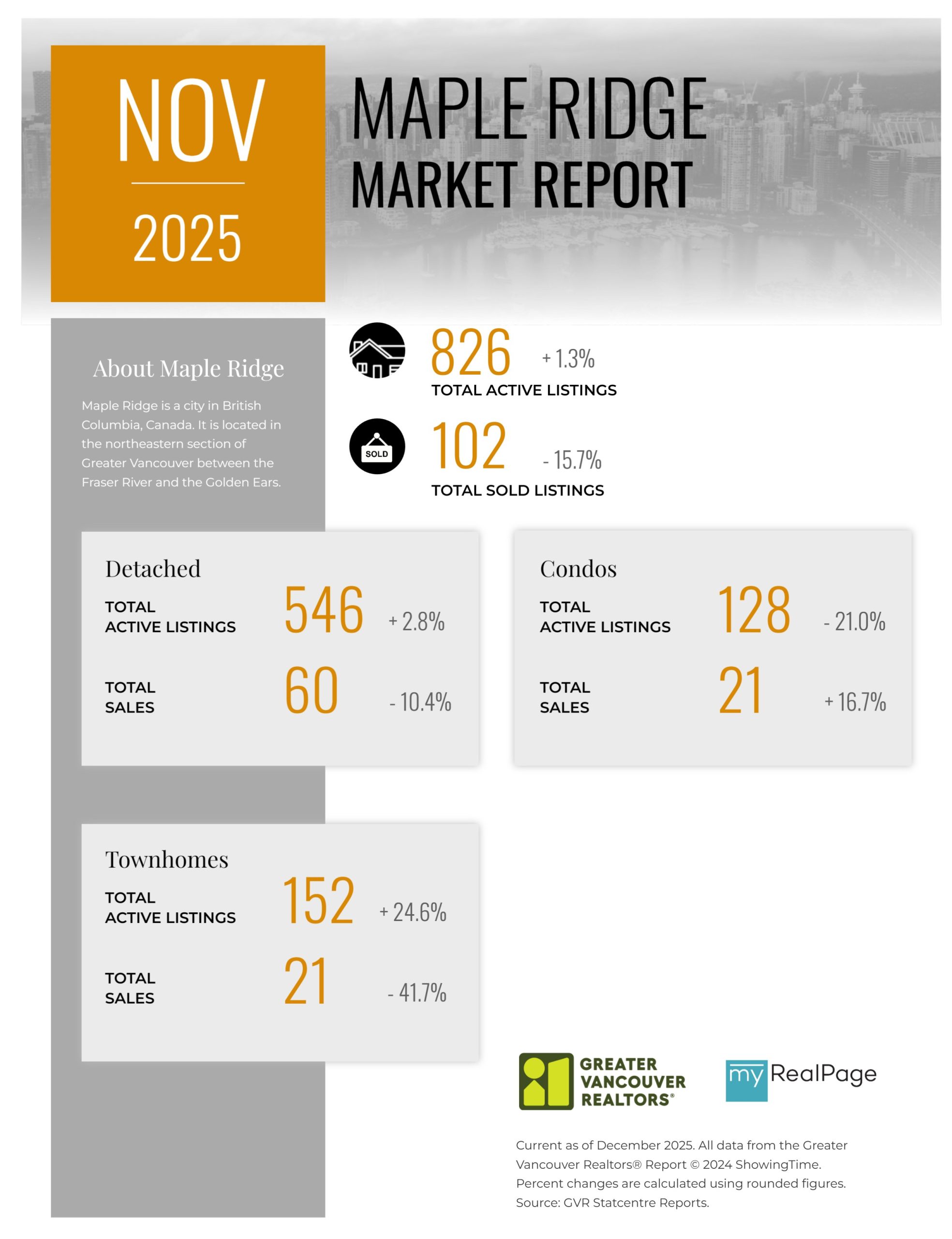 “As the year draws to a close, the data continues telling a story of a market with many buyers patiently waiting and sellers adjusting to market conditions not seen in years. Inventory remains healthy, providing buyers ample choice, which, by contrast, is pushing sellers to accept that pricing must reflect this new reality. Buyers and sellers are striking deals when their expectations are aligned and reflective of the current market – not the market of years ago.” said Andrew Lis, GVR director of economics and data analytics